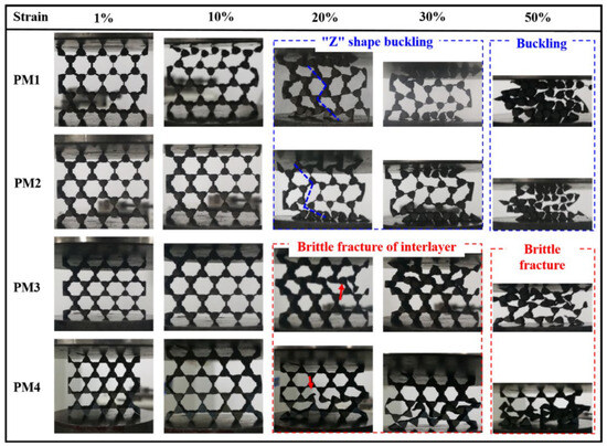 Additive manufacturing is widely used to fabricate complex three-dimensional models that are impossible for other machining methods to create. Three-dimensional PMs are fabricated by dip-in 3D direct laser writing [18,40], 3D printing [41], SLM [42,43], etc. Two-dimensional PMs are mostly fabricated by the SLM method with metal materials. The mechanical properties of the AlSi10Mg alloy fabricated by SLM and casting have been comparatively studied, and some properties were improved by SLM [44]. Zhang et al. [45] utilized SLM to fabricated four types of PMs with different strut widths, named PM1, PM2, PM3, and PM4. The strut widths of PM3 and PM4 were larger than those of PM1 and PM2. Compression testing was conducted on these models. Digital photos of the models at the strain values of 1%, 10%, 30%, and 50% are shown in Figure 10. The results revealed that SLM-manufactured PM structures exhibited dimensional errors, but their elastic properties matched the target characteristics quite well. The experiments showed that, as the strut width increased, the deformation mechanism of the PM structures transitioned from plastic deformation to brittle fracture. This research verified the feasibility of the SLM technique in the fabrication of PM structures and revealed the deformation mechanism of them with different strut widths.