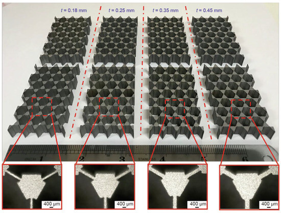 The Poisson’s ratio and compressive modulus of two-dimensional PM structures were also studied for SLM-fabricated models. Zhang et al. [46] fabricated a series of two-dimensional PM structures using the SLM technique with Ti–6Al–4V materials. The samples with different strut widths are shown in Figure 11. The mechanical properties of the PM structures with different strut widths and numbers of layers were investigated. Within a thin strut width range of 0.15 mm to 0.45 mm, the compression modulus of the pentamode structure increased, while the Poisson’s ratio decreased. The stress variations were primarily concentrated at the connection points between the struts and the balancing elements. The different strut widths experienced varying stress levels. Furthermore, the elastic modulus and yield stress of the two-dimensional PM structures were decoupled from their relative density. The obtained compressive modulus values were slightly higher than those of the FE results, and the experimental Poisson’s ratio values were slightly lower than the results of the simulations, resulting from the presence of adhered powder particles.