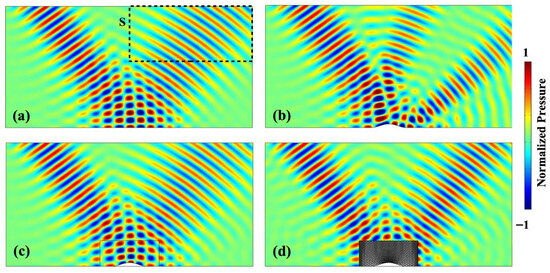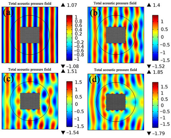 Simulations of four water-like PMs in water: (a) the total acoustic pressure fields for structures composed of PM1, (b) the total acoustic pressure fields for structures composed of PM2, (c) the total acoustic pressure fields for structures composed of PM3, (d) the total acoustic pressure fields for structures composed of PM4 [29].