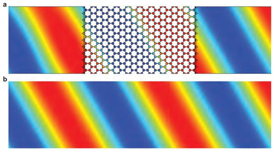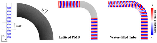 PMs with other types of unit cells have also been studied for water-like properties. The structural parameters of unit cells (as Figure 5c shows) were optimized to approximate the properties of water [30]. Simulations with FEM software were conducted to verify the water-like properties, as shown in Figure 13. It was observed that the oblique acoustic wave propagated the area with no effect on the background (as shown in Figure 13a). The simulation of acoustic waves in pure water was conducted for comparison, as shown in Figure 13b. The PMs have a similar acoustic pressure field with water.