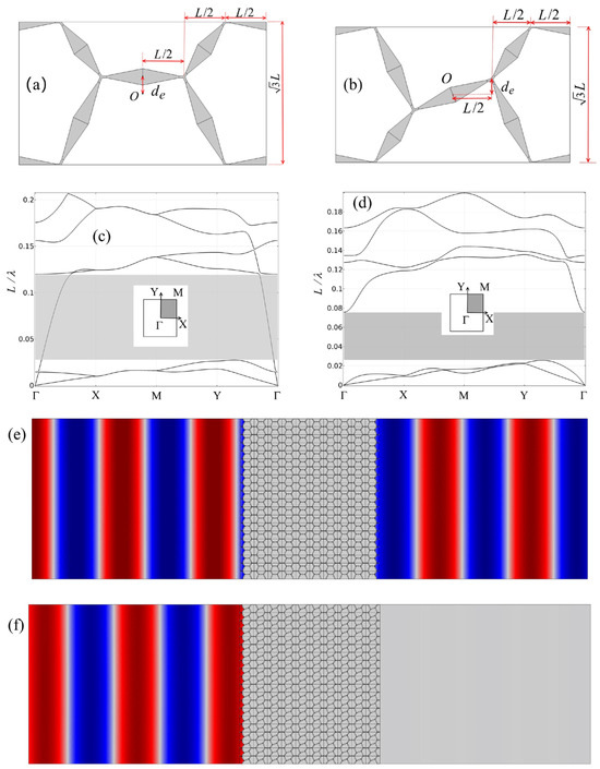 The properties of the PM unit cells are affected by their structural parameters. The dimensions of the arms have been studied. However, the positions of the connection also make a great difference to their effective properties [47]. A rectangular unit cell was also derived for the PMs with the unit cells shown in Figure 2d. There are two connections within the unit cell. If the two connections move upwards or downwards in the same direction, as Figure 14a shows, specific band structures form, which are shown in Figure 14c. There is a frequency range where only the compressional mode exists. The FEM simulation of the materials composed of the unit cell in the background of water is shown in Figure 14e. The vacancy of the unit cells was filled with air in the simulation. The result shows that the PMs have fluid-like properties. The acoustic waves propagate through the material without a loss of energy. The phase is changed due to the difference in the effective velocity. If the two connections move upwards or downwards in opposite directions, as shown in Figure 14b, specific band structures of the unit cell form, which are shown in Figure 14d. There is a total bandgap rather than a pentamode band. The bandgap means that waves cannot propagate in the materials. The simulations of the materials in water also verify this theoretical property.