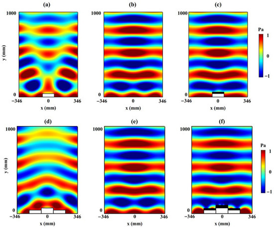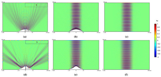 Acoustic pressure field under normal incidence for an uncloaked object, a cloaked object, and flat ground: (a,d) present the reflected wave pressure from uncloaked objects; (b,e) present the reflected wave pressure from cloaked objects; (c,f) present the reflected wave pressure form flat ground for comparison [51].