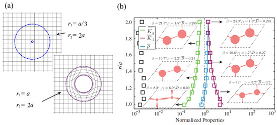 Omnidirectional cloaks are more advantageous because they can hide the enclosed space for waves incident from any direction. The properties of annular cloaks can be derived with the transformation acoustics method. If an acoustic cloak with inner radius a and outer radius 2a is designed by transforming from the virtual space of inner radius a/3 and outer radius 2a (as shown in Figure 18a), specific properties are derived, which are anisotropic and inhomogeneous. The properties can be used to guide the design of the pentamode unit cells. The solid lines in Figure 18b indicate the theoretical properties of the cloak. The unit cells with equivalent properties approximating the theoretical properties of acoustic cloaks were designed, as shown in Figure 18b, in which the squares indicate the promising applications of the materials in the fabrication of acoustic cloaks [28].