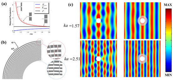 Design of acoustic cloaks with PMs: (a) design of acoustic cloaks with transformation acoustics and (b) properties of the unit cells to approximate the properties of the cloak [28].
