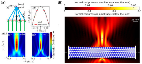 In optics, light can be converged by a convex lens and diverged by a concave lens. Acoustic waves can also be focused by a delicately designed acoustic lens. Tian et al. [53] designed an acoustic meta-surface that could focus acoustic waves. A schematic of the effect of the meta-surface is shown in Figure 20A(a). Acoustic waves were focused on the focal point by the meta-surface. To design this lens, a series of pentamode unit cells with different acoustic velocities were designed and placed delicately, as shown in Figure 20A(b). Simulations with FEM software were conducted to verify the effect of the acoustic meta-surface. The results in two frequencies are shown in Figure 20A(c,d). The meta-surface had obvious effects on focusing the acoustic waves. In addition to this method, Hladky-Hennion et al. [22] designed an acoustic flat lens for focusing acoustic waves via the negative refraction of PMs. The negative index property arose from an isolated branch of the dispersion curves corresponding to a mode that could be coupled to incident acoustic waves in the surrounding water. An aluminum model was fabricated, and the researchers experimentally verified its performance in focusing acoustic waves, as shown in Figure 20B, in which the aluminum model is shown in blue. The source emitting the cylindrical waves at 71.2 kHz was located below the lens, and the focusing effect was observed above. The locations of the source and those of the focus point are shown as black crosses. It can be seen that the acoustic waves emitted from the source on one side focused on a point at the other side. However, it should be noted that different colored maps are shown below and above the slab. The loss of acoustic energy was high, which may be due to the poor impedance matching of the lens with water.
