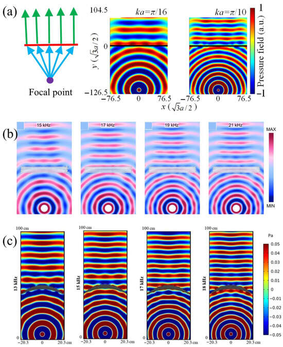 - Chen, Y.; Hu, G. Broadband and High-Transmission Metasurface for Converting Underwater Cylindrical Waves to Plane Waves. Phys. Rev. Appl. 2019, 12, 044046. [Google Scholar] [CrossRef]