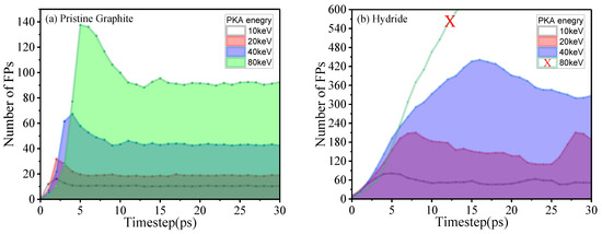 In Figure 1b, the occurrence of two distinct peaks (at 7 ps and 28 ps) at 20 keV requires a closer examination of the defect and structural phases. These peaks arose from interactions mainly with H atoms, leading to more FP. Though these were most common in only one displacement direction, the presented results are averages. Surprisingly, despite fewer H than C atoms, this behavior underscores the unique aspects of the radiation damage environment. In hydride, the FP counts were 6–7 times higher than in pristine, attributed to hydrogen’s role in reducing the TDE to below 30 eV, as has been concluded in other studies [31]. This increased defect rate suggests the hydride’s reduced stability compared to pristine. Additionally, hydrogen atoms can penetrate the graphene structure when exceeding 200 eV [32], whereas other recent studies have stated that the penetration threshold energy can be penetrated at much lower energies [33]. This information is important in irradiated graphene where passivating the carbon dangling bonds with hydrogen atoms in irradiated graphene delocalizes the charge density, reduces the density of states at the Fermi level, and increases the band dispersion, thereby tuning the properties of graphene for additional electronic functionality [34].