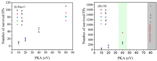 Head-on collisions, like in the [0001] direction, often result in greater energy deposition. This direction typically has the lowest TDE energy in many crystals, including graphite and graphene. Consequently, a lower TDE means atoms are more readily displaced, as indicated in references [36,37]. As PKA energy rises, differences in defect formation between crystal directions become clearer, as seen in Figure 2a,b. For example, at 80 keV, there is a notable gap in defect counts among the five displacement directions, but this gap narrows at 10 keV. This is not unique to carbon; materials like Iron and Tungsten show similar patterns [38,39,40]. The amplified differentiation at higher energies might arise from inherent directional threshold variations and the effects of focused cascade collisions. In hydride, radiation causes many more defects than in pristine. Since hydrogen atoms are smaller than carbon atoms, they can fit between carbon spaces, disrupting the structure and creating more defects due to the weakened carbon–carbon bonds [41]. Our results also observed that, under the same PKA energy and collision cascade conditions, the number of broken C-H bonds was higher than that of C-C bonds (Video S0a,b). In hydride, the effect of direction on defect formation is clearer. For example, in the <1123> direction (i.e., d direction), the material remains more stable. Hydrogen atoms mainly stay within their layer, reducing the risk of hydrogen buildup. During irradiation, these atoms tend to move away from vacancies, leading to hydrogen voids. They also cluster, which can weaken the material. The presence of hydrogen, due to its weaker bond with carbon, further enhances the chances of void creation. At 40 keV PKA energy, the [1100] direction behaves differently. Irradiation here results in 700 FPs, much more than about 250 FPs in other directions (Figure 2II). This is due to the densely packed atoms in the [1100] direction, which is also graphite’s c-axis where layers of graphene stack. The c-axis’s weaker bonds make it more prone to radiation damage. Graphite’s structure, with loosely connected graphene layers, shows layer-by-layer damage upon radiation. The top layers take most of the hit, while deeper layers, with diminishing radiation energy, have fewer defects. These layers can also slide, causing radiation to affect neighboring layers [42]. However, at 80 keV PKA energy, radiation damages multiple graphene layers, resulting in an average of 1200 to 1700 FPs across all PKA directions (Figure 2II). But, thanks to the natural strength of graphene and how radiation spreads, deeper layers might mostly stay untouched if the energy fades before reaching them.
