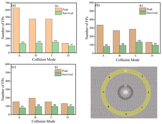 However, the density of the energy deposited at the impact spot is relatively higher than that when it was a single PKA; thus, there is a higher chance for the local excavation of material [53]. Comparably, simulations have shown that cluster–surface collisions lead to the compression of material at the initial stage of impact and the pressure can locally rise to a GPa level [54]. Thus, more PKA would relatively lead to a stronger compression rate and, thus, a larger TDE due to compression strain and, finally, lower FPs, as shown in modes A and B as compared to mode C (Figure 3a).