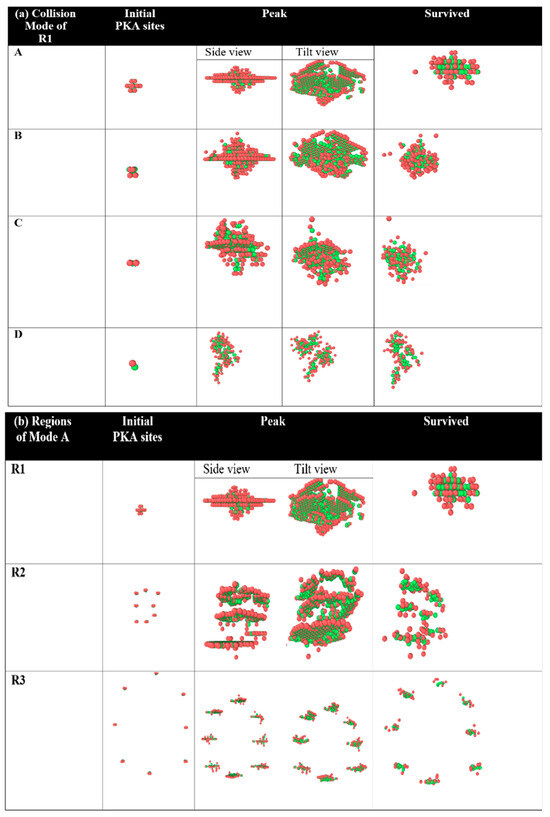 (a) Depicts the collision Modes A, B, C, and D within Region 1 (R1). (b) Illustrates the regions R1, R2, and R3 specific to Mode A. The figure highlights initial PKA sites, peak numbers of FPs, and the number of FPs that persisted. SIAs are represented in red, while vacancies are shown in green.