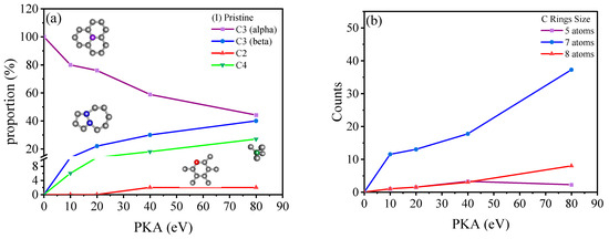 In graphite systems, it is common to characterize atoms based on their coordination, which is generally believed to correspond to sp, sp2, and sp3 hybridization, indicating two, three, and four neighboring atoms, respectively [57]. Nevertheless, observation of electron-energy-loss-spectra data for irradiated graphite has underscored the significance of categorizing threefold-coordinated atoms into four subtypes [58]. The classification of these subtypes depends on the immediate surroundings such as the coordination of second neighbors, involvement in aromatic rings, and so forth. In this work, we adopt the main four categorizations with slightly different nomenclature than described originally in this work [59]. Figure 5a depicts the atom-type composition of the four structural models, showcasing the impact of increased PKA energy and disorder. The proportion of C3-Alpha atoms (indicated by Violet color) exhibits a steady decline within the targeted irradiated damaged region. In irradiated-graphite models, the C3-Beta atoms (indicated by blue symbols) are increasing, which refer to sp2 atoms belonging to a non-hexagonal ring, and which are more prevalent than C3-Alpha at 10 keV. The observed radiation damage-induced defects also include interlayer cross-links, which are known as fourfold-coordinated atoms (C4; green symbols) that are shown to be more common, especially for 40 keV and 80 keV. Unsaturated graphene edges (C2 atoms; red symbols) are responsible for the presence of threefold-coordinated atoms bonded to fourfold- or twofold-coordinated atoms [60]. These defects play a crucial role in the stability and properties of graphene-related systems [61]. The population statistics of the graphite can be viewed as a continuation of the trends seen in the other three models (i.e., C3-Alpha, and total threefold-coordinated-atom percentage decreasing with damage and the percentage of other types increasing) (Figure 5a). The total threefold-coordinated-atom percentage of graphite is somehow akin to the percentage from previous EDIP calculations of amorphous carbon [59]. The decrease in C3-Alpha and total threefold-coordinated atoms is matched to the increased irradiation damage. On the other hand, the formation of carbon rings of specific sizes is evident, as displayed in Figure 5b. Predominantly, the 7-carbon atom ring emerges as the most prevalent, with its frequency intensifying as PKA energy increases. This is followed by the 8-carbon atom ring. On the contrary, rings comprising five carbon atoms are comparatively infrequent. Notably, at elevated PKA energies, the incidence of these 5-carbon atom rings begins to diminish.
