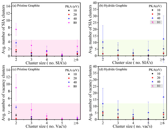 We explored the cluster details within graphite systems, where in Figure 4b and Figure 6a, we examine the changes in the average number of interstitial clusters, while Figure 6c,d focus on vacancy clusters. One clear trend stands out: as PKA energy surges from 10 to 80 keV, there is a commensurate rise in the cluster formation in both materials. The formation of small clusters dominated by interstitial atoms, termed SIA clusters, is notably different between the two systems. In pristine graphite, the concentration of these SIA clusters, specifically in the size range of two to four atoms, is nearly half of what is evident in the hydride structure. The disparity becomes even more pronounced for clusters larger than four atoms, where the hydride structure hosts a concentration over six times that of its pristine graphite. A closer inspection reveals that pristine predominantly favors the formation of small clusters, typically comprising less than four atoms, be it vacancies or SIAs. In marked opposition, the hydride variation inclines toward the amalgamation of more sizable clusters, particularly when the PKA energy surpasses 40 keV. This highlights a key observation: the hydride structure exhibits a distinctive characteristic of generating larger cluster formations, whereas pure graphite tends to foster smaller, compact clusters. Such variances may be attributed to the inherent lattice dynamics and bonding variations existing between the two materials. The presence of hydrogen may promote the accumulation of defects due to reasons explained in Section 3.1.1, thereby facilitating the formation of larger cluster formations. Conversely, the closely knit lattice of pristine graphite might facilitate rapid defect recombination, ultimately leading to the formation of smaller clusters.