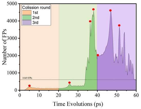 Interestingly, after 10 ps of the third collision, the number of FPs started to decrease. This suggests that graphite has a natural self-recovery capability. Past studies have also observed graphite’s ability to restore its structure, especially when subjected to high-temperature annealing [66,67]. However, it is crucial to note that the graphite still retains some residual stress [42], which can induce other defects if observed over an extended period. After experiencing multiple collision events, the graphite’s structure is no longer pristine. These defects can make the structure more vulnerable to future breakdowns, even though a significant portion of FPs revert to their initial configuration.