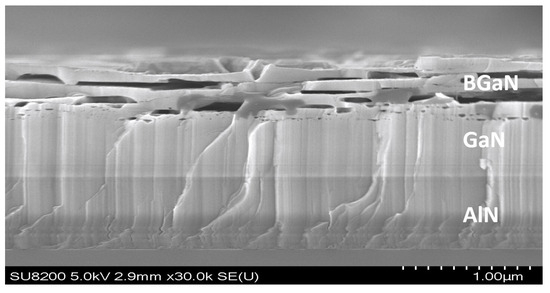 SEM micrograph of cross section of GaN layer and BGaN layer grown at 1090 °C.