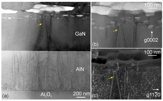 Figure 4 shows the results of the TEM studies of the cross-sectional sample grown at 1090 °C and oriented along the [1–100] GaN zone axis. The bright field scanning TEM is shown in Figure 4a. The image in Figure 4a shows the region containing sapphire, AlN buffer, the GaN layer, and BGaN “plates”. Consistent with the SEM results, the TEM results of the BGaN layer show the texture structure and mosaic character of this layer. The TEM image shows that threading dislocations (TDs) start at the AlN/sapphire interface. Most of the threading dislocations terminate at the AlN/GaN interface, while some propagate through the GaN layer. The imaging of the TDs using different diffraction conditions (Figure 4b,c) shows that the dislocations crossing the AlN/GaN interface have mostly 1/3<> Burgers vectors, making them mixed character TDs. Some of these dislocations terminate at the inner void surfaces in the BGaN layer (like the TD marked with the yellow arrow in Figure 4c), while others reach the large voids present in the Stranski–Krastanov/Volmer–Weber interface, leading to a reduction of the TD density inside the textured BGaN layer.