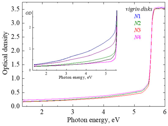 The spectra of optical absorption were measured at RT in a spectral range from 1.5 eV up to about 6.5 eV by means of a high-absorbance spectrometer JASCO V-660 for the same diamond disks before and after exposure to energetic ions. According to Figure 1, the absorption spectra of our pristine CVD diamond samples can be measured until the beginning of the diamond’s fundamental absorption above 5.5 eV (the characteristic free exciton emission at 5.25 eV is detectable in low-temperature cathodoluminescence spectra, see, e.g., [12,25,26,27]). The absorption at lower exciting photon energies belongs to the so-called as-fabricated imperfections, including light scattering on the rather expanded structural defects and grain boundaries.