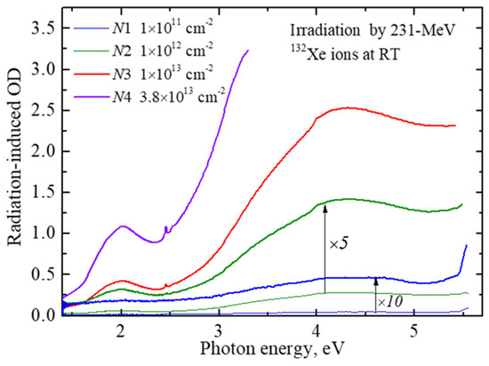 In many wide-gap materials (the majority of metal oxides, semiconductors), the formation energy of a vacancy–interstitial Frenkel pair exceeds the energy gap Eg by several times (see, e.g., [15], and references therein). Therefore, the Frenkel defects in these materials are predominantly created via the elastic collisions of energetic particles (electrons, neutrons, ions) with material nuclei, while the efficiency of ionization mechanisms is extremely low (in contrast, the decay of excitons and relaxed electron–hole pairs mainly lead to Frenkel defect creation in alkali halides) [16,17]. There is a large number of relevant publications on the creation/accumulation/annealing kinetics of radiation point defects in different wide-gap materials exposed to energetic ions (see, e.g., [18,19,20], and references therein). Using the optical absorption (or EPR) method, we determined the integrated amount of radiation defects (and then calculate their concentration) in a whole irradiated volume of the sample (in a thin layer in case of ion-irradiation). Note that the very high density of electronic excitations along swift heavy ion tracks definitely influences material mechanical properties and is responsible for the creation of expanded defects and lattice local disorder (see [21,22,23] and references therein).