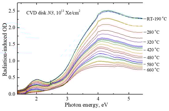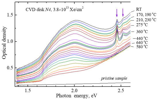 The recovery of radiation damage, i.e., the determination of the thermal stability of radiation defects, has also been investigated via an isochronal (stepwise) thermal annealing procedure. An irradiated sample was heated in an argon atmosphere from RT to a certain temperature Tpr, kept at this temperature for 5 min, and then cooled down to RT by moving the quartz reactor tube with the sample out of the furnace. The absorption spectra were measured after each preheating at the same temperature, RT. Figure 3 demonstrates as examples a set of absorption spectra measured during such a preheating procedure, performed for the CVD disks irradiated with different fluences of xenon ions. For a better visualization of the changes in intensity of the narrow bands around 2.5 eV, the absorption spectrum at 1.4–2.6 eV is shown in Figure 4 (and the absorption of a pristine sample is not subtracted in this case).