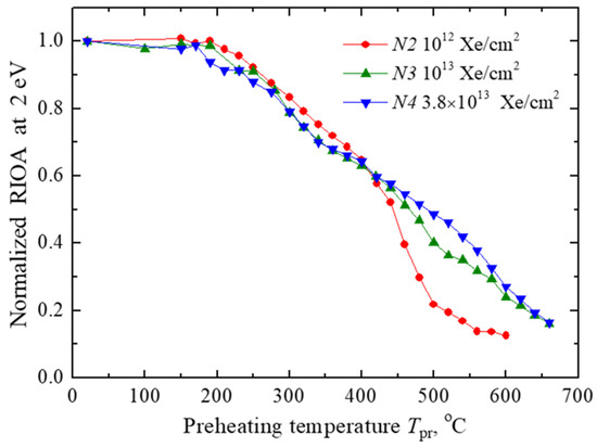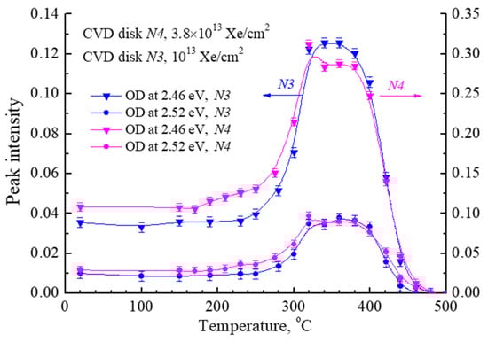 Based on such sets of absorption spectra, the dependence of certain defect concentrations on the preheating temperature can be constructed if the relation of RIOA to the relevant defects in different spectral regions is established. Figure 5 demonstrates the temperature behavior of the concentration of radiation defects responsible for the two narrow RIOA bands around 2.5 eV (peak intensity at 2.46 or 2.52 eV above broad band absorbance is taken as a measure of relevant defects). The defect concentration first increases significantly at 250–320 °C, and the decay of both defect types occurs at 380–460 °C. Such temperature dependence, with a rise stage, is typical of an additional formation of the defects (concentration increase), from the components of similar but less temperature-stable defects becoming mobile with a rise in temperature. A further analysis of the annealing behavior of relevant defects, the concentration of which is rather low especially in sample N3 (compare ordinate scales in two parts of Figure 5), still lies ahead and will be considered in a separate paper.