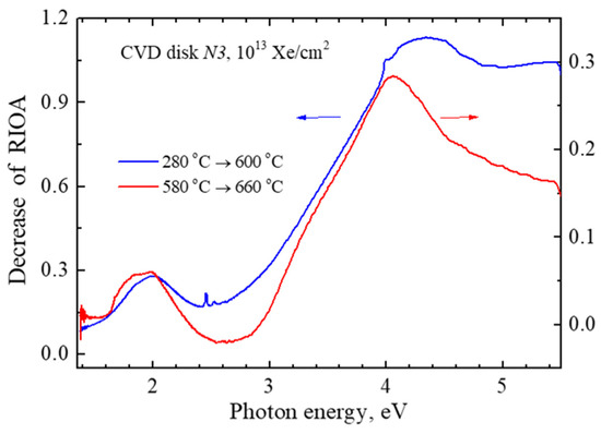 Note that the precise separation of interstitial-related RIOA is rather complicated, because only two thirds of definitely complex RIOA around 4 eV are annealed at Tpr = 660 °C, which is the limit of our measurements. According to our earlier experience with the annealing of radiation-induced damage in CVD diamond disks, the degradation of the CVD disks starts at Tpr > 700 °C and leads to total loss of optical transparency and a rather intense swelling at higher Tpr. The first manifestations of CVD diamond degradation were also observed in our present samples at Tpr > 660 °C (the noticeable rise of a background first starts at 2.3–3 eV and then covers a whole spectral region).