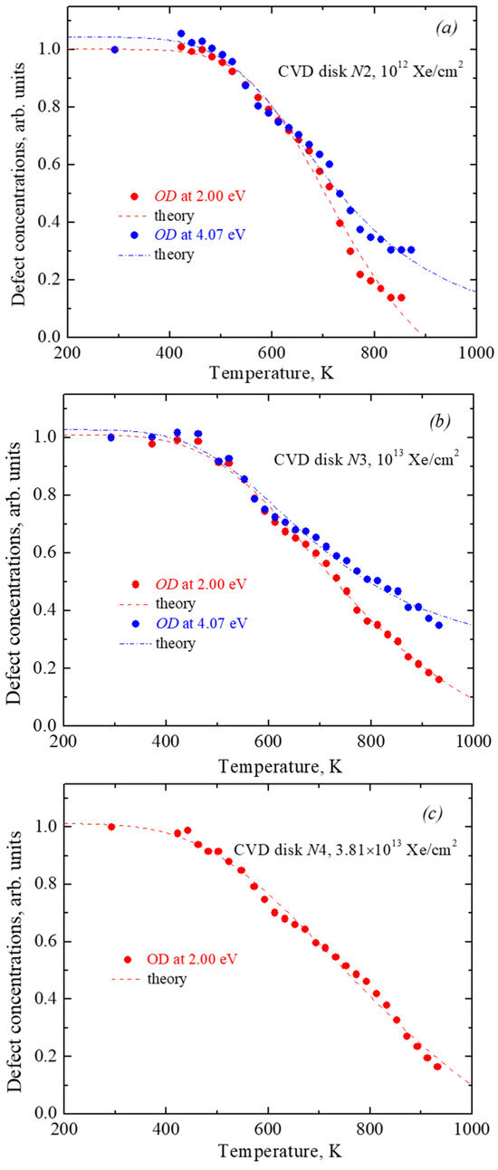 Nevertheless, we succeeded in measuring an almost total annealing process of the vacancy-related RIOA band around 2 eV in three samples irradiated by Xe ions, with fluences starting from Φ = 1012 Xe/cm2. Figure 7 demonstrates the normalized dependences of the concentration of radiation-induced carbon vacancies (RIOA at 2 eV) on the preheating temperature in these irradiated CVD disks. The lowest fluence of Φ = 1011 Xe/cm2 does not cause RIOA sufficient for the analysis. Only these experimentally obtained kinetics curves will be analyzed in the next section, in terms of diffusion-stimulated bimolecular recombination reactions.