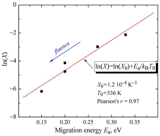 Thus, we have some confirmation of the considerations expressed just above (text related to Figure 6) about the correlation of the annealing kinetics of two absorption bands, 2.0 eV and 4.07 eV. Both bands result from the recombination of the same type of interstitial sites. An additional analysis (below) strengthens this claim. There is every reason to believe that bands at 2.0 eV and 4.07 eV form a kinetic doublet, so the results in Table 1 can be combined and examined using statistical methods. The table reveals two effects. On the one hand, the activation energy of diffusion systematically decreases with increasing fluence. On the other hand, the values of the kinetic factor X also simultaneously change.
