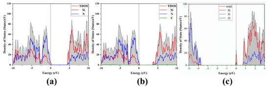 (a) γ-Si3N4, (b) C@γ-Si3N4, and (c) O@γ-Si3N4 density of states plots.