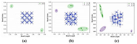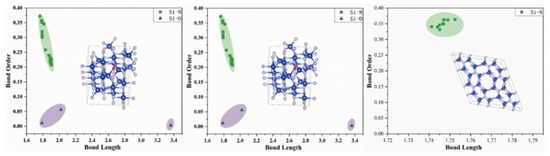 It can be seen from the bond length and bond order distribution plots that the contribution to the bond level of pure Si3N4 (Figure 6) was mainly due to Si-N bonds. The Si-N bonds in the β-form (Figure 7) were mainly distributed in the length range of 17.4–1.76, and the bond order fell between 0.325 and 0.375. The Si-N bond lengths in γ-Si3N4 (Figure 8) were ca. 1.79 and ca. 1.89, with a bond order of ca. 0.36 and ca. 0.23, associated with silicon–nitrogen tetrahedra and silicon–nitrogen octahedra. After doping with C and O atoms, the Si-O bond order was close to 0 for both the β- and γ-phases. The results reveal that the presence of lattice oxygen in the Si3N4 crystal results in a loss of bond order, reducing strength and stability. The incorporation of oxygen into the lattice results in a decrease in Si-N bond order in the two crystal forms to varying degrees, indicating differing levels of influence on bonding strength.