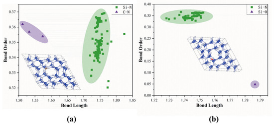 (a) C@β-Si3N4 and (b) O@β-Si3N4 bond length and bond order distribution plots.