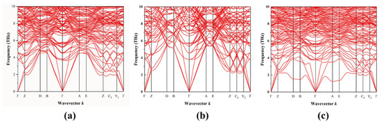 (a) β-Si3N4, (b) C@β-Si3N4, and (c) O@β-Si3N4 phonon spectra.