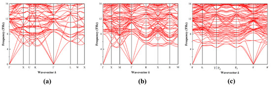 In order to assess the dynamic stability and thermal conductivity of the six configurations under consideration, the second-order force constant was calculated using first principles, and the associated phonon spectra and phonon density of states were obtained, as shown in Figure 9, Figure 10, Figure 11 and Figure 12. The phonon spectra did not include any imaginary frequencies, indicating that the systems exhibited dynamic stability.