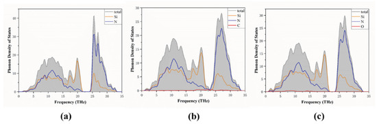 (a) γ-Si3N4, (b) C@γ-Si3N4, and (c) O@γ-Si3N4 phonon density of states profiles.