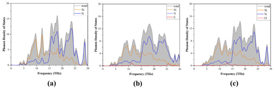 (a) β-Si3N4, (b) C@β-Si3N4, and (c) O@β-Si3N4 phonon density of states profiles.