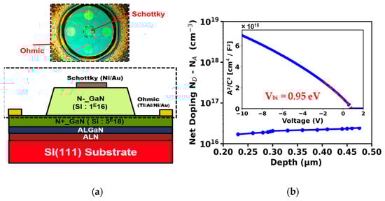 (a) Schematic cross-section of quasi-vertical Schottky diode using localized epitaxy. Inset: optical microscopy of the circular measured devices. (b) Net doping concentration (ND − NA) in the n-GaN drift layer from the C-V curve at 1MHz. Inset: (A2/C2) versus the reverse voltage (The red dotted line corresponds to the fit).
