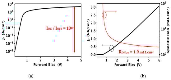 Figure 2a shows the typical forward J-V characteristics in semi-log scale obtained on a GaN pseudo-vertical Schottky diode, showing a low turn-on voltage of ~0.6 V defined at J = 1 A/cm−2 and a good on/off current ratio of . The device achieved an output current density of ~2.5 kA/cm2 and a low differential specific on-resistance of 1.9 mΩ cm2 at 5V, as shown in Figure 2b, despite the expected current crowding effect at the edges in quasi-vertical structures [19]. The ideality factor n of 1.03 and the Schottky barrier height of 0.95 eV (consistent with the extracted Schottky barrier height from C-V measurement ~1.02 eV) were extracted from Equation (2), at room temperature (RT = 300 K). The high on/off current ratio and near-unity ideality factor indicate the good quality of the Ni/n-GaN interface. These characteristics suggest efficient electron flow when the device is on and minimal leakage when the device is off, showcasing the interface’s effectiveness in controlling current. Additionally, the near-unity ideality factor implies that the diode closely follows ideal diode behavior, indicating the domination of thermionic emission (TE) [20].