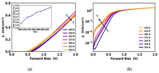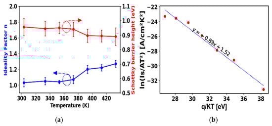 From Equation (2), from the intercept and the slope of the linear region of the ln (J)-V plot, and n can be determined, respectively. In Figure 4a, the ideality factor n of several devices increases from 1 to ~1.3 ± 0.05 at higher temperatures, which may indicate the impact of the surface traps on device performance [20]; the extracted n suggests that the thermionic emission (TE) dominates the current transport mechanism at low temperatures (from 300 K to 375K) and the thermionic field emission (TFE) at higher temperatures (T > 375 K). The variation in the barrier height when the temperature is between 375 and 425 K, as shown in Figure 4a, confirms the impact of traps on the Ni/GaN interface. These results suggest the thermal instability of the Schottky barrier height of the SBD at high temperatures [20,21].