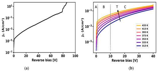 To study the reverse leakage mechanisms, the temperature dependence of reverse J-V for Ni/Au SBDs was measured from 313 to 433 K with a voltage range up to −40 V, as presented in Figure 5b. The characteristics can be categorized into three distinct voltage regions. Region “A” represents near-zero bias, region “B” represents bias from −1 to −10 V and region “C” is bias from −10 to −40 V. For Schottky devices under a reverse regime, the voltage is sustained across the drift region, forming a depletion layer, with the highest electric field situated at the metal–semiconductor contact. The breakdown voltage is restricted by breakdown at the edges. Edge terminations are necessary to reduce the electric field at their location, leading to behavior closer to parallel-plane breakdown.