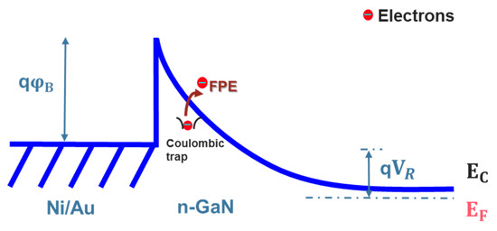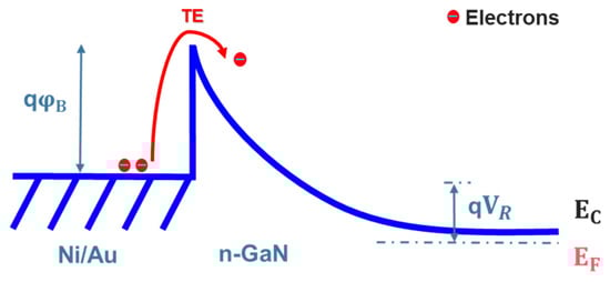 In Region A, the leakage current seems to be limited by the Schottky contact, for which the conduction mechanism is dominated by Schottky emission. Electrons can gain sufficient energy by thermal excitation; electrons from the metal will overcome the Schottky barrier towards the conduction band. Figure 6 illustrates the Ni/n-GaN energy band diagram under negative bias. The most observed conduction process in Schottky barriers diodes (SBDs) is thermionic emission (TE).