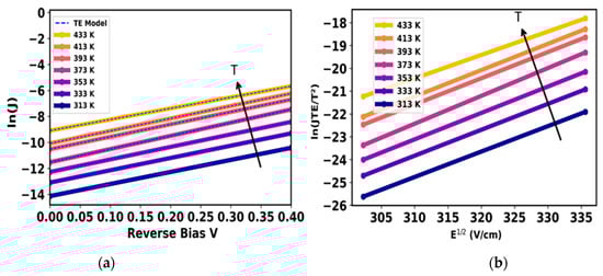 Figure 7a shows the reverse ln (J) versus V obtained at different temperatures at voltages from 0 to −0.4 V. The good fit between the experimental data and the thermionic emission (TE) model suggests that TE is the main mechanism at near-zero bias with barrier lowering of (the barrier lowering due the image force phenomenon is called the Schottky effect). Furthermore, the linear relationship between ln (J/T2) and E1/2, as shown in Figure 7b, confirms the dominance of this mechanism in this region.