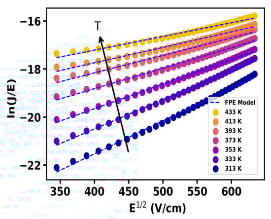 According to the FPE equation, ln (J/E) should have a linear relationship with the square root of the electric field (note that the electric field (E) was calculated using Equation (3)) as shown in Figure 9, which indicates that FPE is the dominant leakage process in Region B.