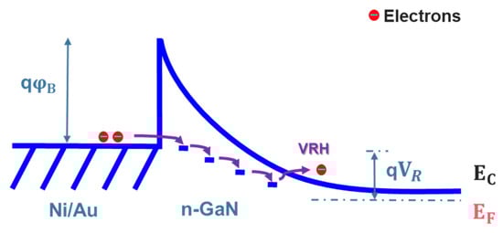 Finally, in Region C, when the reverse voltage increased up to −40 V with a corresponding electric field up to 1.1 MV/cm, the leakage current became insensitive to the temperature. This indicates that the reverse leakage is probably dominated by variable range hopping (VRH), for which the increased electric field distorts the energy band and makes it steeper. This results in a shorter hopping from the Schottky Fermi level and the VRH level in the GaN drift layer. Consequently, the hopping of electrons becomes easier from the Schottky metal to the GaN drift layer [29,30]. Figure 11 illustrates the schematic energy band diagram of the VRH mechanism.
