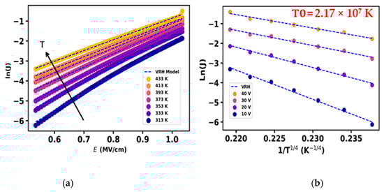 The clear linear dependency between ln (J) and E is demonstrated, as shown in Figure 12a, suggesting the dominance of VRH. Figure 12b shows an Arrhenius plot of the reverse current at several voltages versus the inverse of the temperature. At a high electric field, the current has a lower temperature dependency and follows Mott’s law, [ln]. The extracted characteristic temperature T0 is 2.2 ± 1.1 × 107 K, which is within the typical range of 106–109 K and is consistent with reported values in the literature (4.92 × 107 for ND ~3 × 1016 cm−3) [31,32].