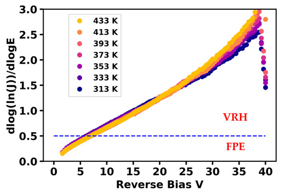 The investigated mechanisms were further confirmed by having the differential slope d[log(ln(J))]/dlog(E) as presented in Figure 13, where J is the current density and E is the applied electric field in the depletion region. When d[log(ln(J))]/dlog(E) is around 0.5, the Frenkel–Poole emission (FPE) process dominates the leakage current. On the other hand, if d [log (ln(J))]/dlog(E) is close to 1, the variable range hopping (VRH) is the mean leakage mechanism [25].