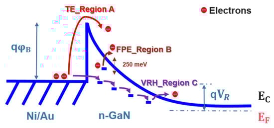 Figure 14 summarizes and illustrates the different leakage mechanisms revealed by temperature-dependent study of GaN-on-Si quasi-vertical SBDs grown by localized epitaxy. In Region A, thermionic emission (TE) dominates the leakage current since the applied voltage has a negligible impact on the Schottky barrier, in which electrons are transported from the metal to the n-GaN layer. As the bias increases, trapped electrons gain sufficient energy to surmount the trap state, which can be referred to as the Frenkel–Poole emission (FPE) process. Finally, in Region C, the increasing electric field reduces the hopping distance from the metal to trap states, which allows the electrons to hop easily from the Schottky metal to the conduction band of the GaN drift layer, which is referred to as variable range hopping (VRH). These leakage mechanisms are in agreement with previously reported studies for GaN devices [33,34,35].