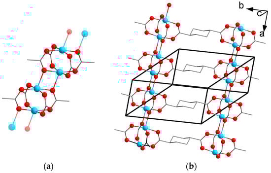 Metal-organic coordination polymers (MOCPs) have attracted significant research attention due to their broad structural design [1,2,3] and targeted modulation of properties that is possible by varying functional metal centers [4], organic ligands [5], and guest substrates [6]. Polynuclear and polymeric blocks consisting of unpaired electron-rich metal ions can present valuable magnetic properties (such as ferro- [7], antiferro- [8], and ferrimagnets [9], as well as slow magnetic relaxation [10,11]), complex luminescence patterns [12,13], redox behavior [14], and unique chemical bonding features [15]. In particular, such metal centers are of interest for the synthesis of MOCPs with designable and unique properties and unveil the usage of coordination polymers in diverse magnetic materials [16], in highly efficient luminophores and sensors [4,17], for data storage [18], and for production of multifunctional and “smart” materials [19].