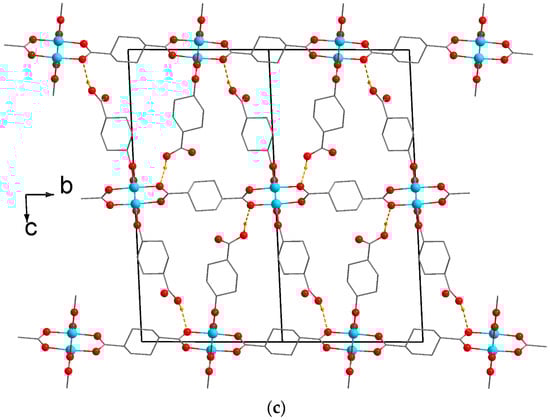 {Cu2(OOCR)4} bi-nuclear blocks and their connection in the structure of I (a). Coordination network in I; view along c axis (b). Three-dimensional package of I; view along a axis (c). Copper atoms are shown in blue; oxygen atoms are shown in red. Hydrogen bonds are shown by orange dashed lines.