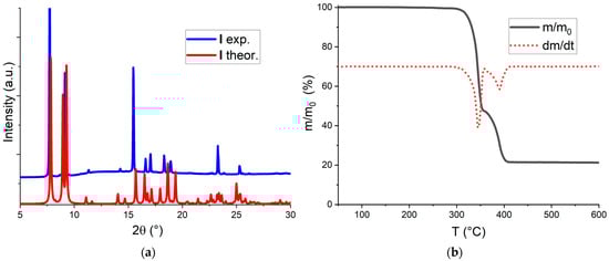Powder X-ray diffraction pattern of sample I compared to the theoretical one (a). TGA curve and dm/dT plot for I (b).