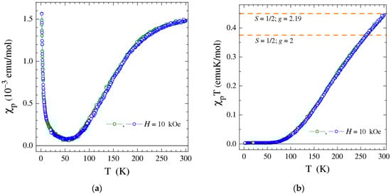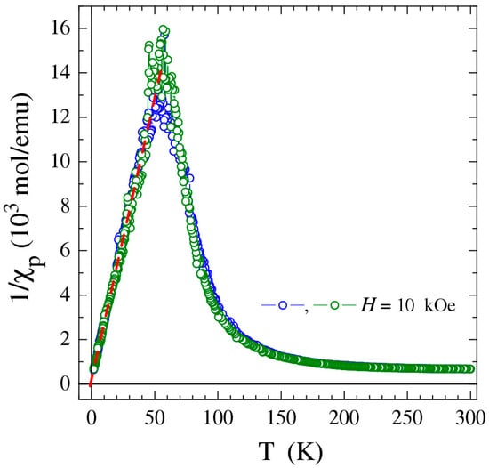 In the low-temperature region (T < 60 K), an increase in χp is observed (Figure 3a), which is associated with the presence of impurities retaining their paramagnetic state down to the minimal temperature T = 1.77 K. An impurity paramagnetism of sample I apparently arises from the decomposition of bi-nuclear blocks in near-surface crystallite defects with the formation of single Cu2+ ions [40]. As can be seen from Figure 3a, there is virtually no overlap of temperature ranges at points where significant contributions to the magnetic susceptibility of AF dimers (T ≥ 70 K) and paramagnetic impurities (T ≤ 50 K) are observed. This allows the concentration and magnetic parameters of single Cu2+ ions to be determined by simply approximating the low-temperature χp(T) data (Figure 4) using the Curie–Weiss dependence —where NA and kB are the Avogadro number and the Boltzmann constant, respectively, μeff is the effective magnetic moment of a single Cu2+ ion, and θ is the Weiss constant—reflecting its interaction with neighboring copper ions. In turn, the analysis of the χp(T) dependence in the region T ≥ 70 K has shown good agreement with the behavior theoretically predicted for AF Cu2+–Cu2+ dimers [39]. Accordingly, a quantitative analysis of the data over the entire temperature range was carried out using the modified Bleaney–Bowers formula [39], which takes into account the presence of AF dimers and monomer molecules: