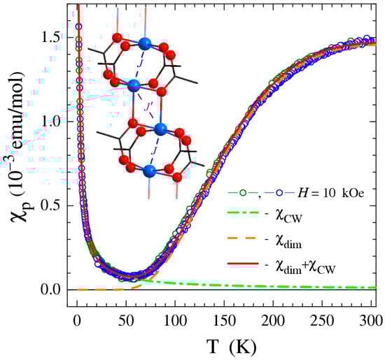 where χdim and χCW are the magnetic susceptibilities of dimers and monomers, respectively; δ is the mole fraction of dimers transformed into monomers; g is the g-factor of Cu2+ ions (assumed to be the same for dimers and monomers); and J is the exchange interaction energy between copper ions in dimers described by the Hamiltonian . As can be seen in Figure 5, the experimental data can be approximated very well using Formula (1) with parameters J/kB ≈ −495 K; g ≈ 2.19; δ ≈ 0.45 mol. %.