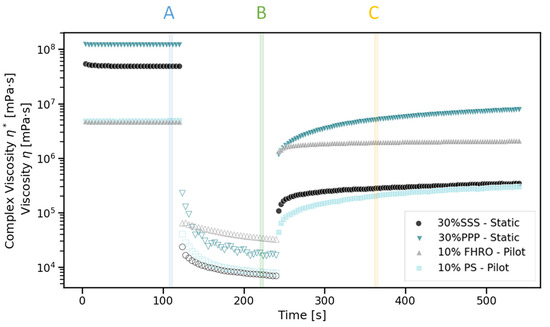 In the second interval, also known as the “high-shear phase”, the sample is sheared at a constant shear rate (10 s−1), and due to the sample’s shear-thinning behavior, a reduction in the complex viscosity modulus is observed. Traditionally, a loss in viscosity can be associated with the deformation or alignment of structures. This interval spans between 120 s and 240 s, and the complex viscosity modulus progressively decays, reaching its lowest values at the end of the interval. When compared to the initial viscosity values, the drop in viscosity is particularly high for the 30% PPP static sample, while the 10% FHRO pilot scale sample seems to have a moderate loss in viscosity.